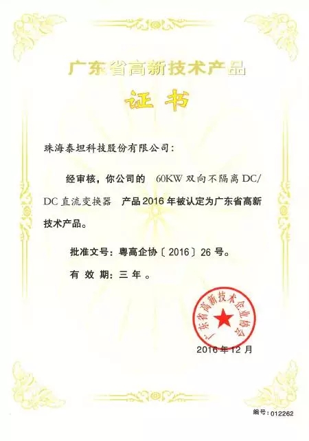 本次获得广东省“高新技术产品”认证的包括:泰坦集团下属企业珠海泰坦科技股份有限公司的两个产品:“60KW双向不隔离DC/DC直流变换器”,以及“TYBC系列预装式变电/充电站”;而泰坦集团另一个子公司珠海驿联新能源汽车有限公司“驿充电运营管理系统”也榜上有名。以上产品均通过高新技术产品的认定,证明泰坦集团的产品及服务再次获得权威认可。