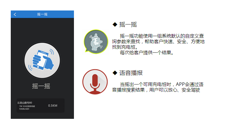2、摇一摇:系统匹配最优方案充电桩,语音播报匹配结果;